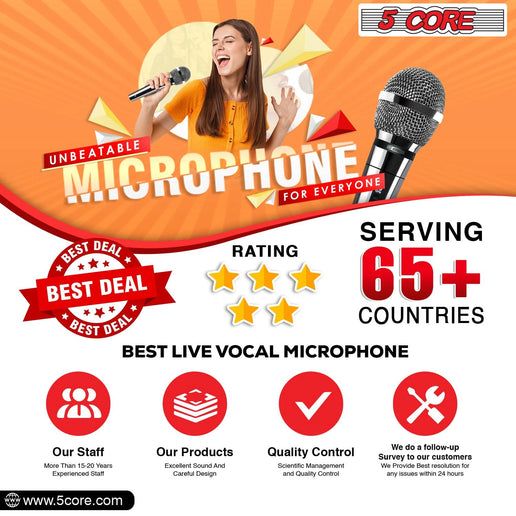 Experience superior audio quality with the 5 Core cardioid karaoke microphone, designed to deliver brilliant sound reproduction while reducing noise and feedback. The wide frequency response in the dynamic microfono ensures consistent sound pickup from the source and keeps its natural form. You don't need to do a lot of equalization to get the perfect sound. This is a professional vocal microphone for singing, designed to offer you clarity and amazing sound. A standard wired XLR to 1/4 inch plug connection lets you enjoy reliable performance. There is no latency or radio wave interference. This rugged plastic microphone is made from fresh ABS material with a reinforced steel windscreen to safeguard internal components. Even if you drop the anti-dent ring, keep this microfono safe. Ideal vocal microphone for singing, karaoke, DJ, PA, speeches, and more. This dynamic microphone XLR is your go-to for clear, reliable, and professional performance. |